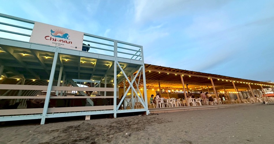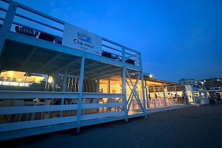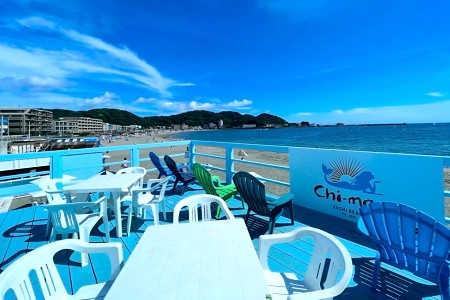 chi-manは逗子海水浴場の海の家です。逗子海岸の鎌倉方面寄り、柱のないアーチ構造のユニークなスチールの建物となります。国道134号線沿いの「ラ・オハナ」と「夢庵」が目印です。